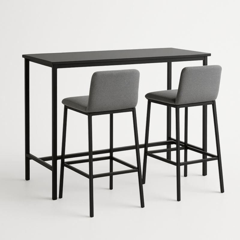 La table possède une structure en acier inoxydable noir avec un plateau en MDF. Les tabourets ont une structure en acier inoxydable noir, avec assise et dossier en tissu polyester gris. Dimensions de la table : 120 cm × 40 cm × 100 cm. Dimensions des tabourets : 45 cm × 45 cm × 100 cm. Poids de la table : 20 kg. Poids de chaque tabouret : 8 kg.